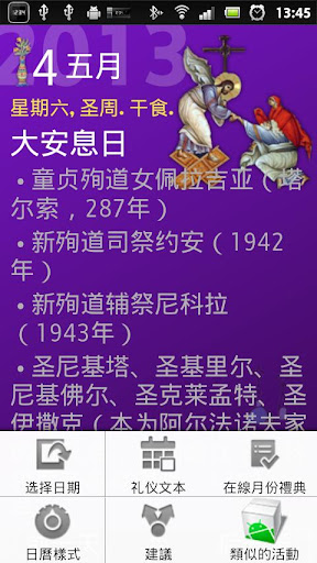 盛宴和圣徒的日历包含了完整的日历。它不需要互联网连接,所以它会显示的盛宴,或圣人的一天,即使你是在西奈半岛或阿索斯山:-)