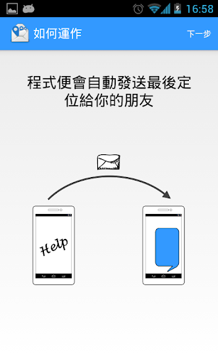 3. 如果你發生意外,而未有在計時倒數完畢前選擇任何動作,此時程式會發送 SMS 給你指定的聯絡人,這個 SMS 會包括了你的定位紀錄,以便他能追查之用