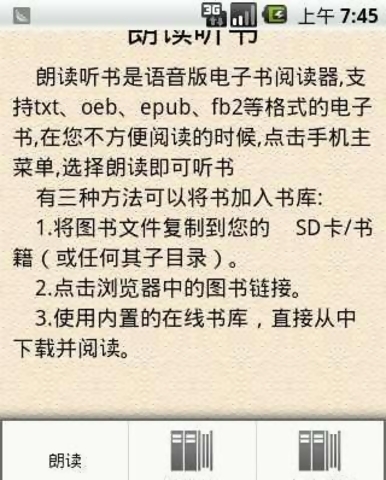 朗读听书是语音版电子书阅读器,支持txt,oeb,epub,fb2等格式的电子书,在您不方便阅读的时候,点击手机主菜单,选择朗读即可听书.