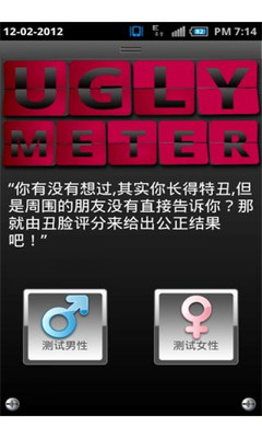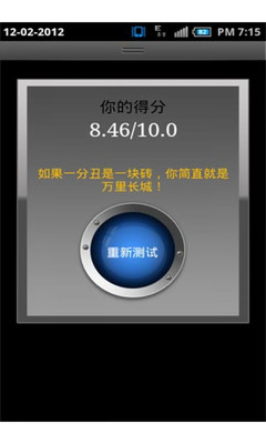 《机器相貌评分》会选取你的一张照片,扫描你的脸部细节,然后通过分析细节数据,给出一个1-10的等级,并且加上一些“评语”,等级越高说明你越丑,所以如果你的等级是10,估计你那张脸只有你妈妈想看了,以后白天就别出门了!总之很恶搞的一款软件,中,快拿去给自己或朋友评测评测吧!