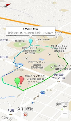 手入力でも記録入力できますが、GPSを利用して、進んだ距離を自動記録することもできます。この経路は記録しておくことができます(第2紹介画像)。さらに、各ポイントの時刻、スタート地点からの距離、タイム、速度等を表示できます。また、経路はリアルタイムでも確認できます。新しく、高度&速度グラフ機能、マップ上での速度別グラデーション表示機能を付けました。時間-距離グラフ、スプリットタイムリスト、月次集計も追加。
