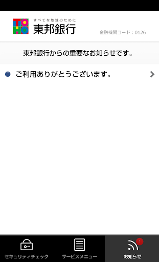 本アプリを起動した際に自動でセキュリティチェックがおこなわれ、ご利用端末の安全性を確認したうえでインターネットバンキングのご利用が可能です。