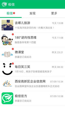 通过这一平台,信息发送方可将优惠信息、最新活动、通知公告、商家动态等消息免费推送给自己的订阅用户;信息接收方,只需安装极信客户端,搜索自己要订阅的极信号,点击订阅即可第一时间接收到自己订阅的极信消息。