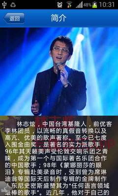 林志炫 app是中国电信爱音乐快速发布平台的明星应用产品,爱音乐旗下还有哎姆DJ、哎姆乐拍、哎姆明星脸等系列客户端。林志炫,以流畅的真假音转换以及高亢、优美的歌声著称。至今已七度入围金曲奖,是著名的实力派歌手,最近在“我是歌手”节目用现场演唱的方式将歌曲一次诠释到位,再次成为热门歌手。喜欢林志炫的朋友们一定不会错过它的客户端,热播音乐、MV资讯、风采写真,万千精彩掌中汇,与您偶像零距离。