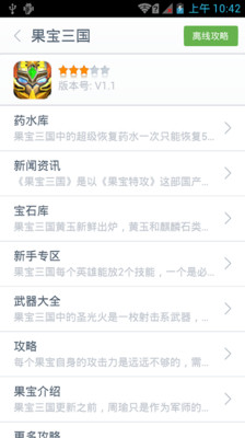 果宝三国,给您不一样的三国。本应用详细介绍了果宝三国的人物属性、武器资料,新手教程以及高手经验分享,让您更快速的上手。本应用以最快的速度每天为您更新游戏资料与游戏攻略,时时让您了解游戏的最新动态。 《手游攻略》客户端,是由讯游提供,专门为喜爱手游的用户提供文字、图片、视频攻略以及资料库的软件。让用户更轻松、愉快的体验游戏的乐趣。 如果有什么问题和建议可以反馈给我们,我们会努力做的更好!