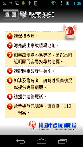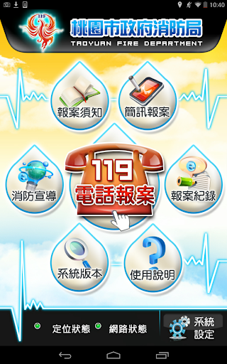 桃園市政府消防局為強化民眾119報案功能,如民眾透過本APP報案,便能傳送經緯度座標資訊至119指揮派遣系統(僅限報案當時),以利消防人員趕赴現場救援,維護生命財產安全。