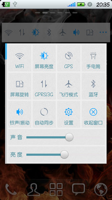 2,支持wifi,gps,飞行模式,屏幕亮度,声音,蓝牙,同步横竖屏切换等多个快捷快关,充分满足用户的需求;