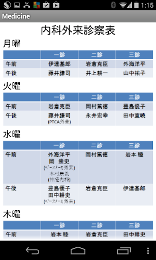 アクセス方法、外来診察表に加え、病院の電話帳およびぜひ覚えておきたい治療目標値を掲載しています。特に電話帳はアプリから病院へ電話を掛けられるようにしましたので、電話番号を覚える必要もなく便利です。