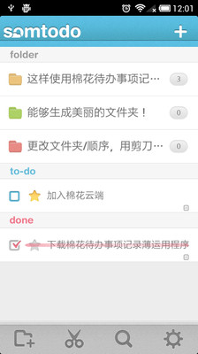 一款任务管理软件,支持建立文件夹为事项归档,当然也可以在主界面中点按右上角的加号快速创建待办事项。点击代办事项可以添加描述和设置提醒闹铃,支持事 情发生前提醒和重复提醒功能,还有10种有爱提醒铃声可选。点击主界面中的剪刀按钮可多选删除事项,移动事项顺序及移动事项至文件夹内。在设置中还可以更 换字体,为软件加锁。