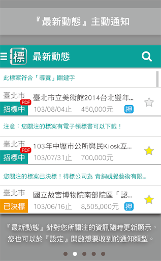 不論身在何處,只要有平板電腦或手機,隨時隨地都可使用,提高您工作效率。主動提醒。讓您即時掌握關注的標案、標籤與關鍵字資訊!就像您的私人貼身秘書,貼心為您服務。