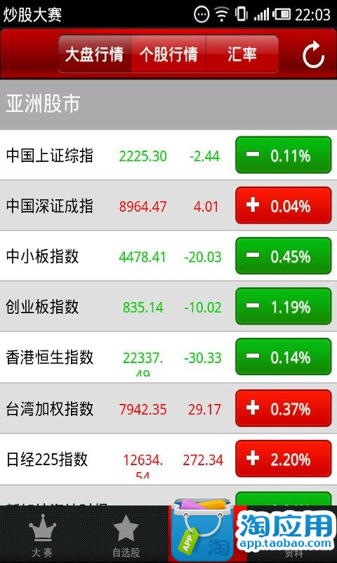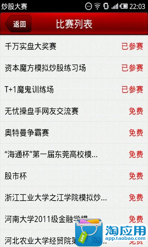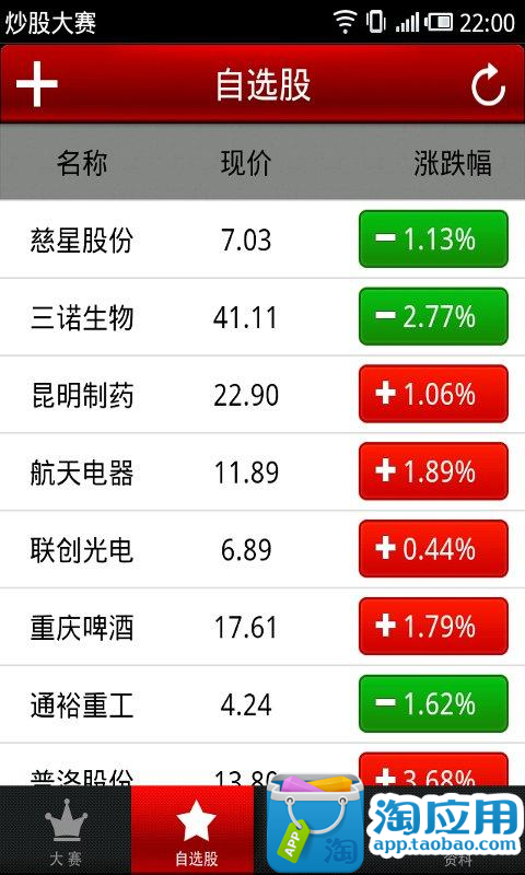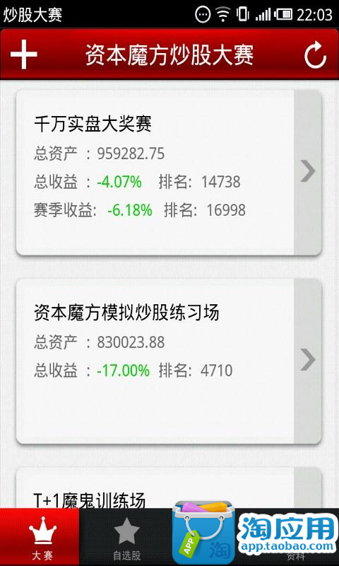 资本魔方炒股大赛是目前国内最好的模拟炒股大赛和模拟炒股训练平台。比赛包括由资本魔方官方举办的千万实盘大奖赛和由证券机构、高校、知名财经网站合作举办的大赛,所有比赛都有非常丰富的奖品。模拟炒股功能可以锻炼自己选股能力和验证选股策略。应用还提供了炒股必备的自选股和财经行情查询功能,你可以方便查看行情。