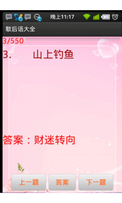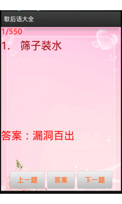 本软件精心收集了大量常用歇后语,生动活泼,趣味盎然,老少皆宜,通过阅读,可以让您在愉悦的品读中熟练掌握歇后语的渊源和用法,并丰富语言材料,增强口头表达能力和逻辑思维能力,对学生作文水平的提高有很大的作用。 如果您觉得此软件还不错的话,记得推荐给好友使用哦!
