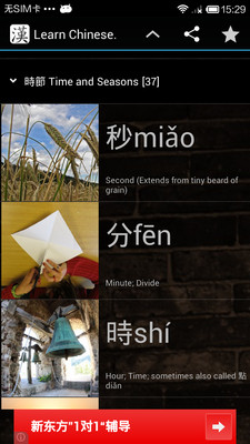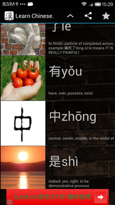 Chinese Characters are just like pictures. This app gives you pretty chosen pictures that will help you to think up its relative Chinese words with their pronunciation provided.