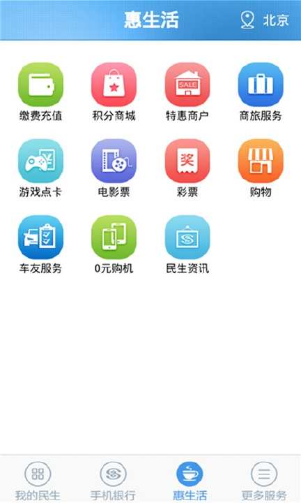 惠生活:话费充值、水电燃气取暖费等日常生活缴费、特惠商户、飞机票火车票购买、全国各地影院影讯查询和在线选座购买影票、积分商城、游戏点卡、华彩彩票、尚品购物、车友服务等移动增值服务应有尽有。