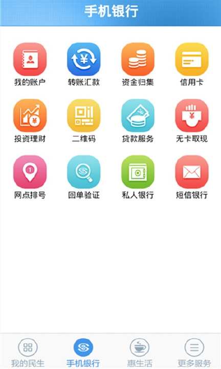 手机银行:为您提供账户查询、转账汇款、跨行资金归集、投资理财、信用卡、二维码收付、无卡取现、网点预约、回单验证、私人银行、短信银行、贷款服务等丰富的移动金融服务。