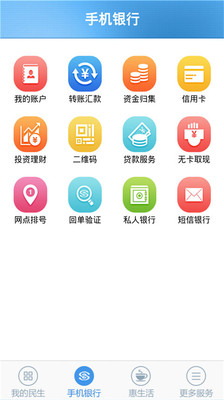 手机银行:为您提供账户查询、转账汇款、跨行资金归集、投资理财、信用卡、二维码收付、无卡取现、网点预约、回单验证、私人银行、短信银行、贷款服务等丰富的移动金融服务。