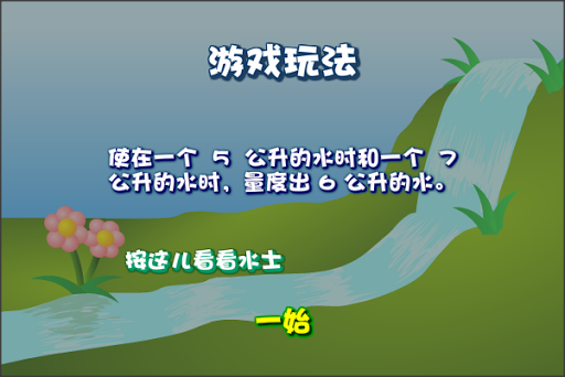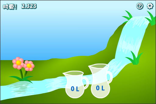 凭您精确的计算能力达成胜利条件吧!在这个游戏里,您的任务是透过使用一个5公升的水瓶和一个7公升的水瓶,量度出6公升的水。游戏开始时,两个空置的水瓶会被放置在山涧旁边的草地上,您可点击其中一个水瓶,并把它拖放到山涧边的指示位置把它装满。接着您可把水倒进另外一个水瓶,或是把水瓶移到画面左边的花朵上,把水倒掉。反复进行以上步骤,直至其中一个水瓶装有6公升的水,便可胜出游戏。您的分数会根据显示在画面左上方的游戏时间而计算。火速完成任务,赢取丰厚分数!