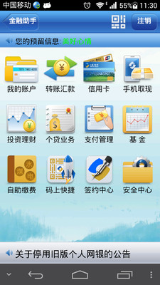 金融助手:金融资讯、网点及优惠商户查询、手机充值、电影票、飞机票、手机证券等移动增值服务应有尽有。