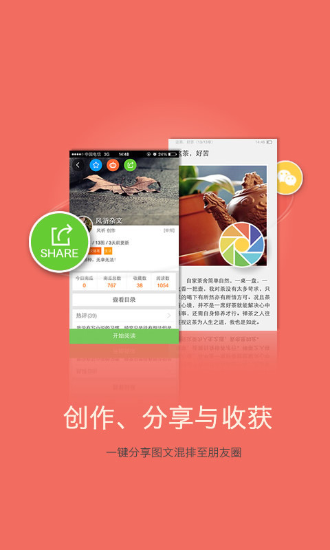 4.方便的分享设计,可以一键将整书或章节分享至微博、朋友圈、人人网等社交网络,更多人可以看见你的大作