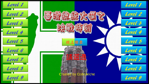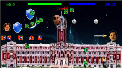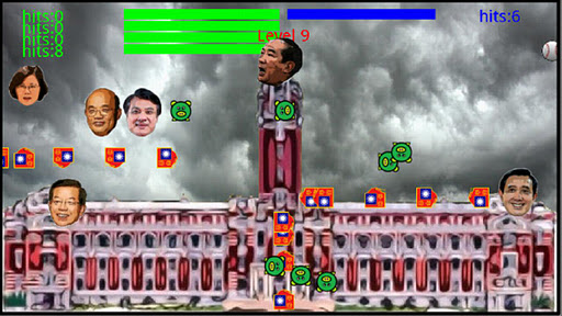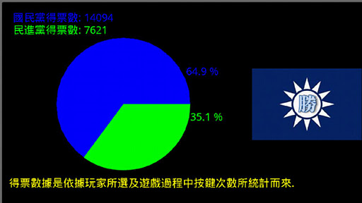 透過 9 道關卡, 讓您逐步打擊另外一個政黨. 遊戲內容充分結合現在時勢,馬家軍的平安符, 菜英文的三隻小豬, 飛彈, 公投炸彈, 以及不同的政治人物供玩家選擇.還有老宋的攪局, 讓遊戲增加可玩性. 玩家所選擇的政黨, 在每局遊戲之後, 會將該局按鍵次數傳送至伺服器, 並將所有玩家的數據作出統計, 玩家可了解各政黨 "得票數".