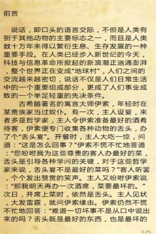 会说话的人,都要懂得创造高潮。他先在前面慢慢营造气氛,把听众一点点带进去,再在大家情绪的高潮,把最精彩的呈现。说话最重要的是要把握重点。对于需要引人入胜的题材,譬如形容你去旅游的经过,你可以按部就班、娓娓道来,但是对于急迫的事,则要开门见山。而所谓的"实话虚说",就是虚说的实话,基本上还是实话,只是说得不够精确,或者说得松散。实话虚说还有个特色,是你可以把"语气"或"语法"掉换一下,内容没改,感觉改了。