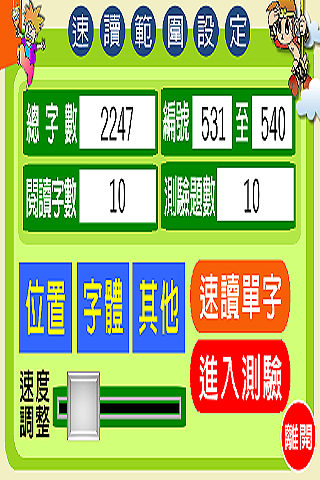 選擇速記課程後,由此設定速讀的速度、範圍,按「開始速讀」鈕即可開始單字速讀,若關閉真人發音,可達到「以眼速讀」的最高境界。另外,個人可針對顏色、字體、定點/不定點等細項作設定。