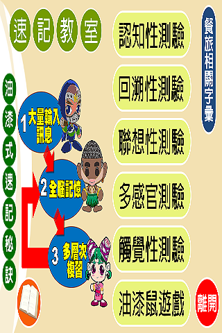 包括認知性測驗、回溯性測驗、聯想性測驗、多感官測驗、觸覺性測驗、油漆鼠遊戲等單元,以及油漆式速記心法的說明按鈕。
