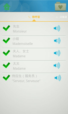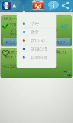 1)字母学习单元 2)音素视频学习单元 3)优美法语单元 4)词句学习单元