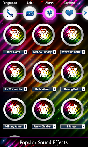 這個免費的Android應用程序分為四個主要部分:新的鈴聲,短信,鬧鐘和喜愛。第一部分介紹了您可以安裝作為鈴聲,或分配酷鈴聲每個聯繫人最新鈴聲!第二部分包含短信的聲音,通知音。第三部分包括高品質的鬧鐘鈴聲。當你聽了所有的3個部分,各種流行的鈴聲中,你可以單獨最好的鈴聲到最喜歡的文件夾,這使得這個免費的應用程序的第四部分。