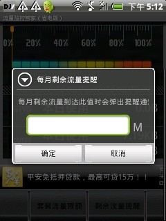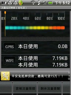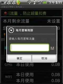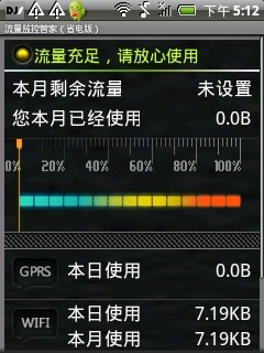 流量监控管家(省电版)[1.2.5]还在为流量超支烦恼吗 赶快来试试这款最新的流量监控软件吧 milestone G3 G6 G7 defy 完美运行 流量准确无误的测试出来经过上述几款比较流行的真机测试 不卡机 省电 都不在话下这一版主要功能包括gprs 使用情况 以及剩余多少wifi的本日使用情况以及本月的使用情况可以设置在剩余多少流量时进行通知告诉赶快行动吧改善了统计流量的逻辑美化了ui修正了一些bug