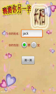 谁都想提早的知道自己的另一半的长相吧?这真是一种恶搞的行为呢,现在就让你放开恶搞下吧,去参与测试你的另一半长相的测试吧,让我们看看你的未来的另外一半长相如何呢?马上开始试试吧,为的你以后的幸福,开始测试一番吧。