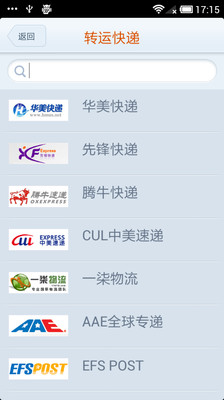 支持转运快递有:百通、飞洋、华美、CUL、风雷、天翼、同舟、先锋、量子、DCS、TWC、海星桥、久禾等近30家转运公司。