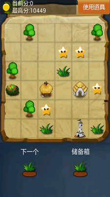 玩家必须在6x6的空地上放置建筑物,利用3个连接相邻的建筑物合并成为更高阶的建筑。从最低的杂草,一路合并成为花丛、大树、房屋和城堡。