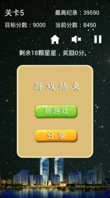 获得高分有2条途径,1条是通过积累多个星星一起消除来获得高分。还有1条是获得最后的奖励,最后剩下的星星越少,得到的奖励越多,如果一个也不剩的话,最后能获得2000分的奖励,这2000的奖励是非常多的,是得高分的最重要保证。