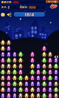 2、 两个及以上同一颜色的狗狗相邻在一起,点击2次就能消灭,一次消灭狗狗数量越多得分越高