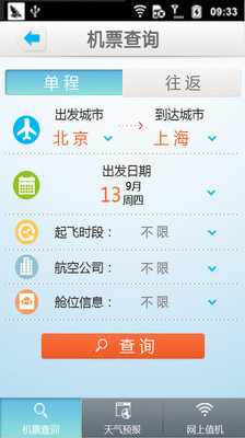 2、预订机票:选定出发地、目的地、出行时间即可完成国内、国际机票查询,点击电话预订按键即可完成机票预订。