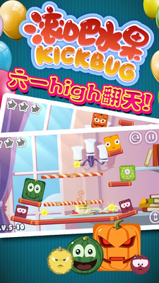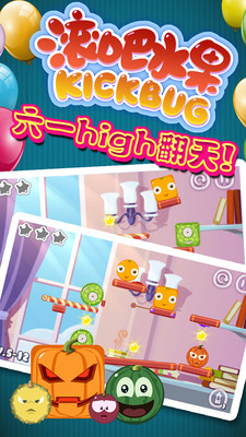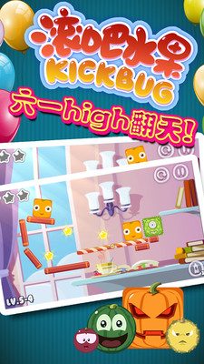 《滚吧,水果》是一款精品物理益智游戏,玩法易懂,操作简单,过程轻松,少有受挫感,非常适合喜欢轻松游戏的玩家。您只需以手指轻触水果,让水果们在“方”和“圆”间转换,以控制它们滚或不滚,通过它们滚动的力量将虫子赶下平台,并且最后自身还能安然停留就能过关!是不是很简单呢?不过,也不要太小瞧它了哦,在赶走虫子的路上会遇到一些星星,可是需要花费一些小脑筋才能把它们全部都吃掉呢。全三星通关也不是那么容易的!