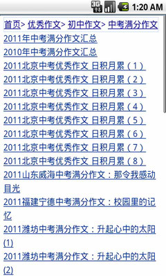 通过手机快速浏览小学、初中、高中满分优秀作文信息。内容包括:小学作文,初中作文,高中作文,话题作文,想象作文,英语作文,优秀作文,作文素材,作文专题,写作指导,应用文,记述文,高考满分作文,写人作文,写事作文,写物作文,写景作文,抒情作文,科幻作文,节日作文,暑假作文,描写作文,毕业作文,议论文,说明文,中考满分作文等信息。