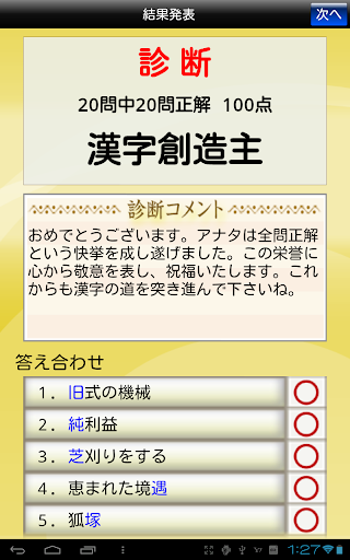 ・読み10問・書き10問 合計20問の書き取りテストに挑戦します。解答終了後にあなたの漢字力が診断されます。