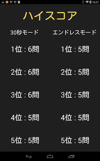 上位5件のハイスコアを確認でき、過去の自分に挑戦できます。