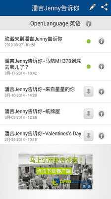 您能通过这个app收听到OpenLangauge英语最新发布的《潘吉Jenny告诉你》脱口秀和一些精选课程。 两位超人气老师一边教你英语、一边分享你不可不知的美国流行文化和职场文化。 想系统性学习英语,请下载OpenLanguage客户端。