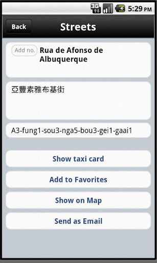 用於查找和翻譯在澳門的書面中文和拼音粵語地址的終極工具。包含500街道,居民區,建築物,場所和觀光景點。的可能性增加街道號碼,你可以創造 100萬個唯一的地址出租車卡。沒有互聯網連接的要求(除地圖和發送電子郵件的功能),所以你沒有得到額外的數據費用。搜索,保存和發送喜愛的地址,並學習如何發音在粵語的地址,使用粵語耶魯拼音系統。