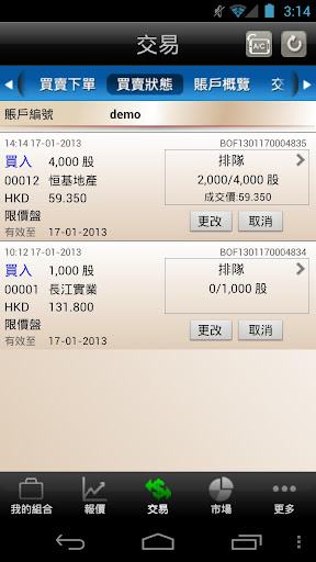 「股票交易」 - 提供「賬戶概覽」客戶隨時隨地查訊帳戶結餘和股票組合、「買賣下單」、「買賣狀態」及「交易紀綠」,操作簡易。