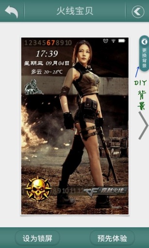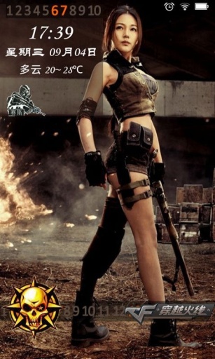动感的CF火线宝贝,把她安装在手机桌面上会有不一样的感觉哦!只要轻轻按住解锁按钮向上滑动就可以轻松解锁,此款锁屏还有天气设置,时刻定位当地的气温,还有简约的时钟,日期,另外在设置里面还有数字密码解锁,九宫格解锁等功能,喜欢的赶快来试试吧!