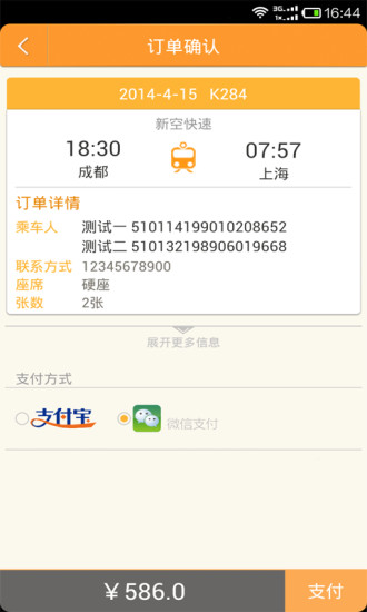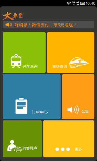 火车票™,使用官方权威数据,可查余票信息;支持站站查询,车次查询等多种火车票数据查询方式。同时,火车票™为用户提供火车票订票服务,支持用户自取票。自取票在售票点或火车站即可出票。全面支持支付宝和微信付款,交易更加放心。全新的metro操作界面,让您的使用更加简单快捷。客服电话:028-85246993客服邮箱:kefu@sochepiao.com企业QQ:800073306微信公众号:乐游火车票