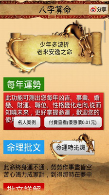 1.八字算命:该功能将详细揭晓您一生的秘密,从家庭婚姻,到学业事业,八字算命都可以详尽为您解答。