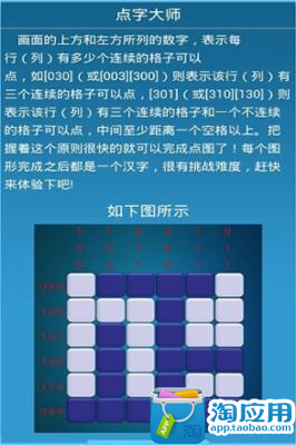 点字大师是一款益智类游戏,玩家要在一个6*6的方格里找出一个汉字,每行每列有多少个格子可以点都已经给出提示。该游戏能够很好的锻炼人的逻辑思维能力,是一款非常好的益智类游戏,很有挑战难度,赶快来体验下吧!