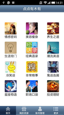 点点有木有是一款基于移动终端的在线垂直信息传播与分享平台,您可以免费浏览各类与生活息息相关的主题信息并分享至SNS平台(腾讯微博、新浪微博、人人网),或者以短信方式发送给好友。这里不仅汇集了情感、美容、小窍门和养生等超人气栏目,还提供星座、职场和理财相关的专业分析。无论身在何处,都将成为您生活的好助手!不信,点点看。 :)