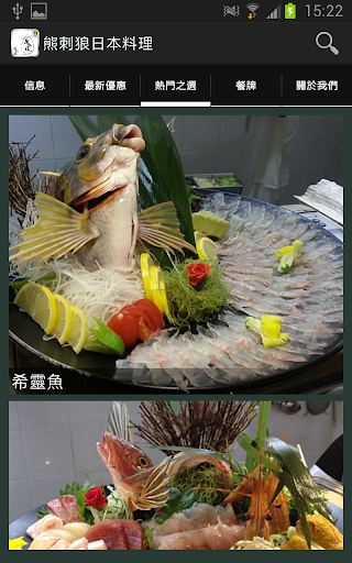 熊刺狼日本料理 Android 手機程式 (Apps), 介紹熊刺狼日本料理的食品如刺身拼盤,燒物及定食, 最新推廣及 店舖資料等.