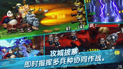 ● 新颖的横版策略塔防玩法:玩家既可化身成主角熊猫施展各种招式,奋勇拼杀在第一线,又可指挥众多小伙伴一起对抗敌人